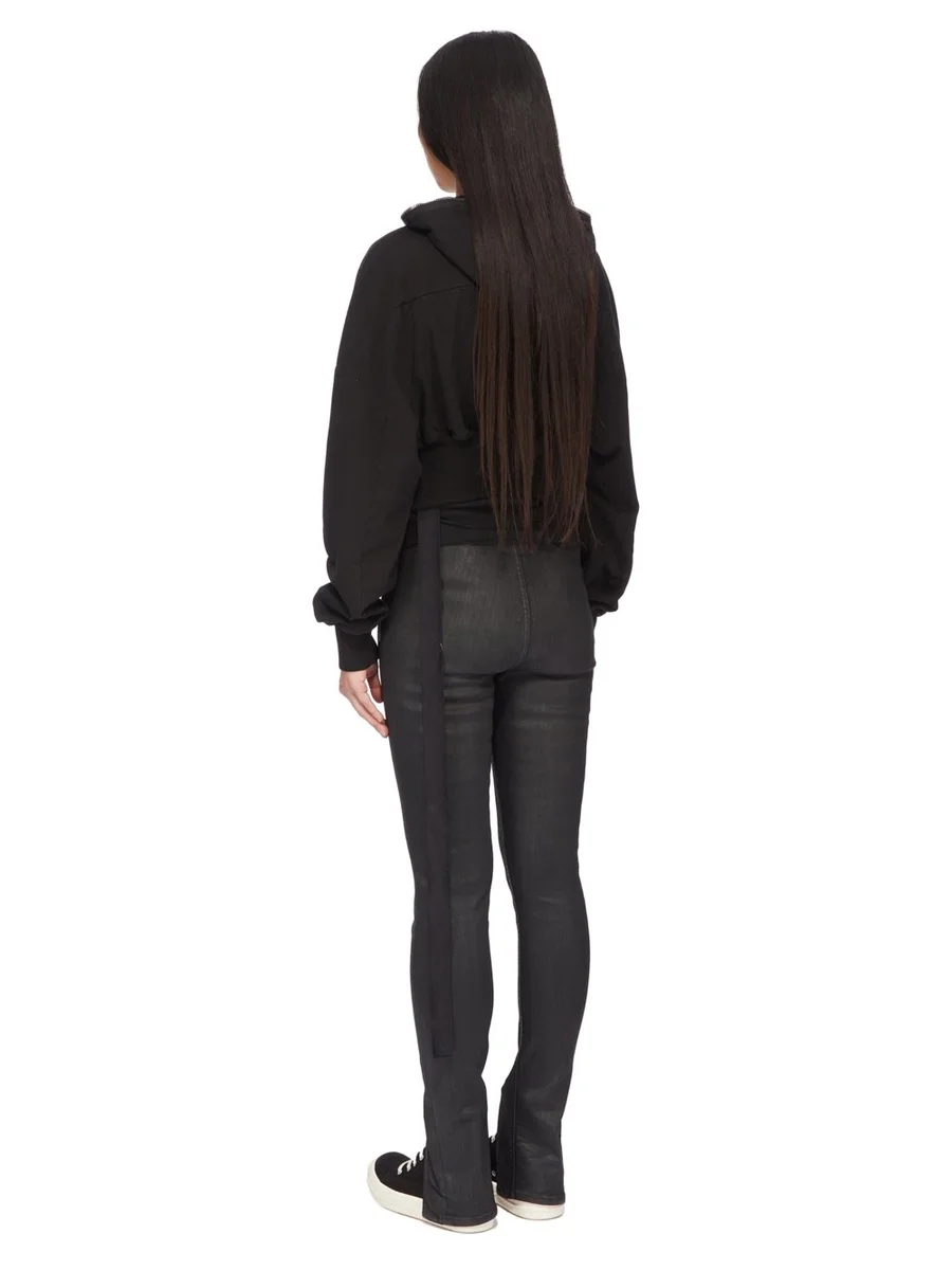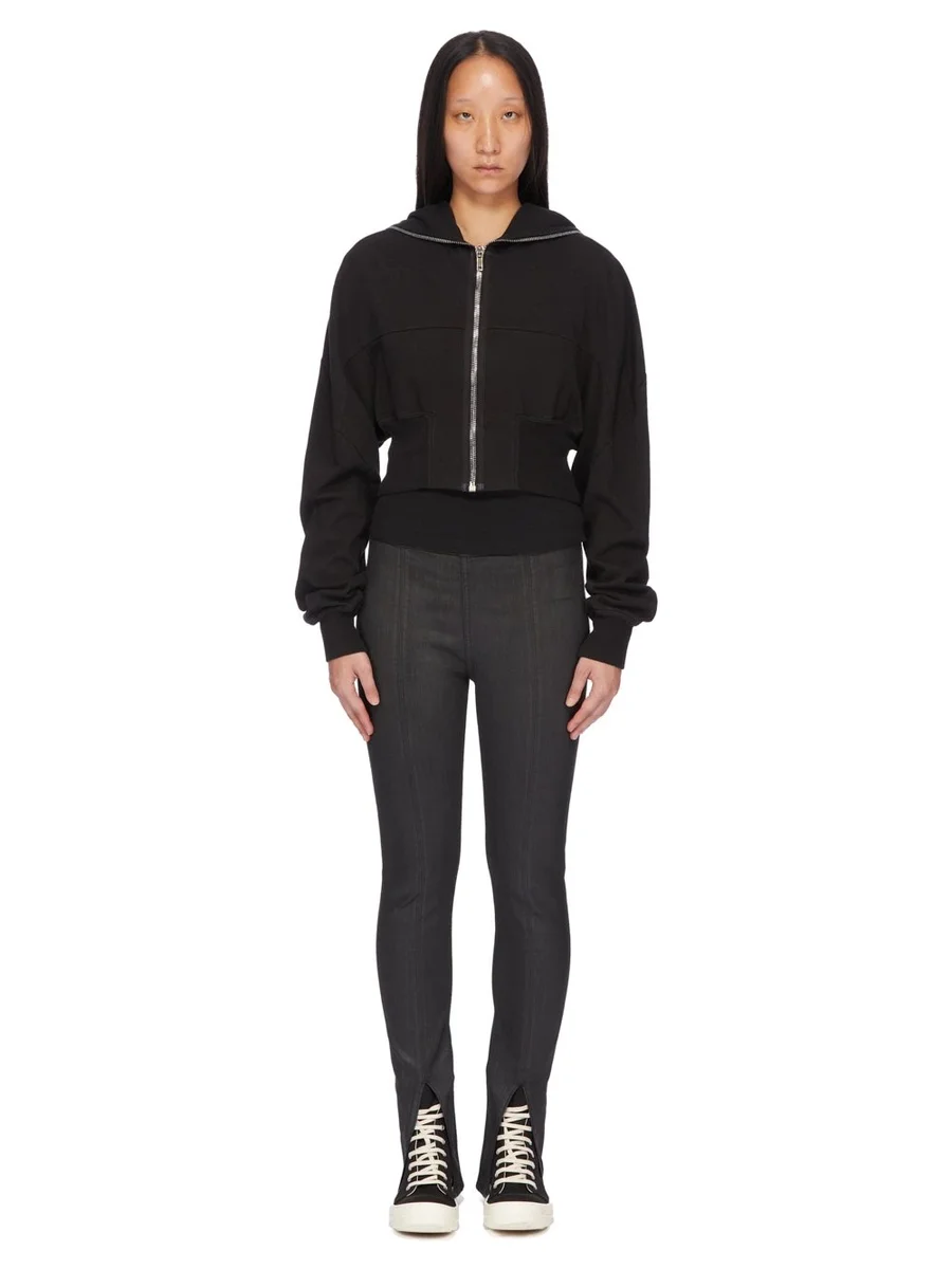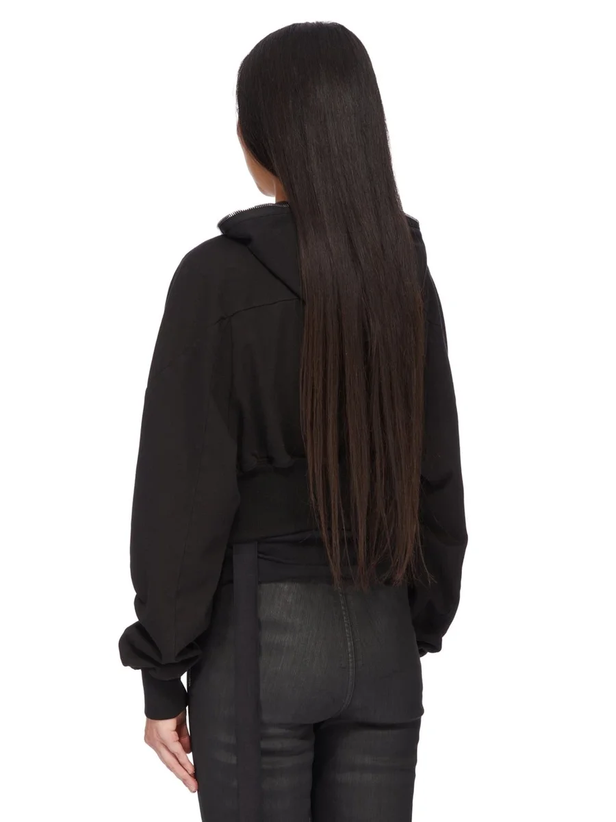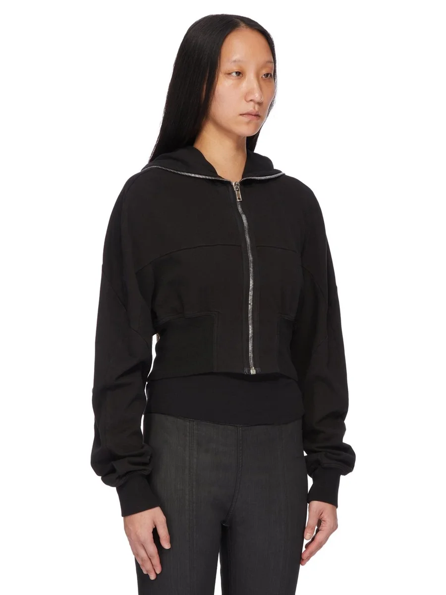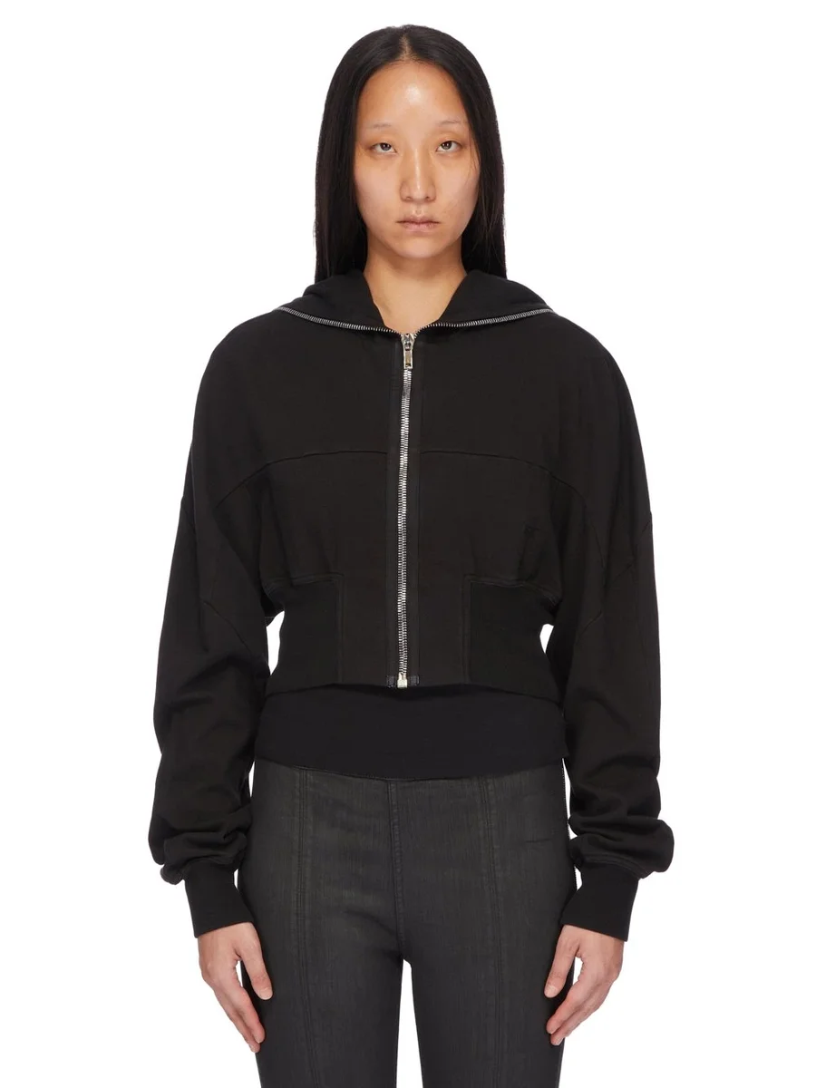 THIS COLLAGE GIMP HOODIE IS CROPPED WAIST LENGTH AND HAS LONG SLEEVES. IT HAS A FRONT ZIPPER CLOSURE WITH EXPOSED ZIPPER TAPE THAT RUNS FROM THE HEM ALL THE WAY UP THROUGH THE HOOD, ALLOWING IT TO BE ZIPPERED COMPLETELY CLOSED OVER THE FACE. IT FEATURES GEOMETRIC GIRDERED SHOULDERS AND STITCHING, A FRONT AND BACK YOKE AND HAS RIBBED CUFFS AND WIDE WAISTBAND.
