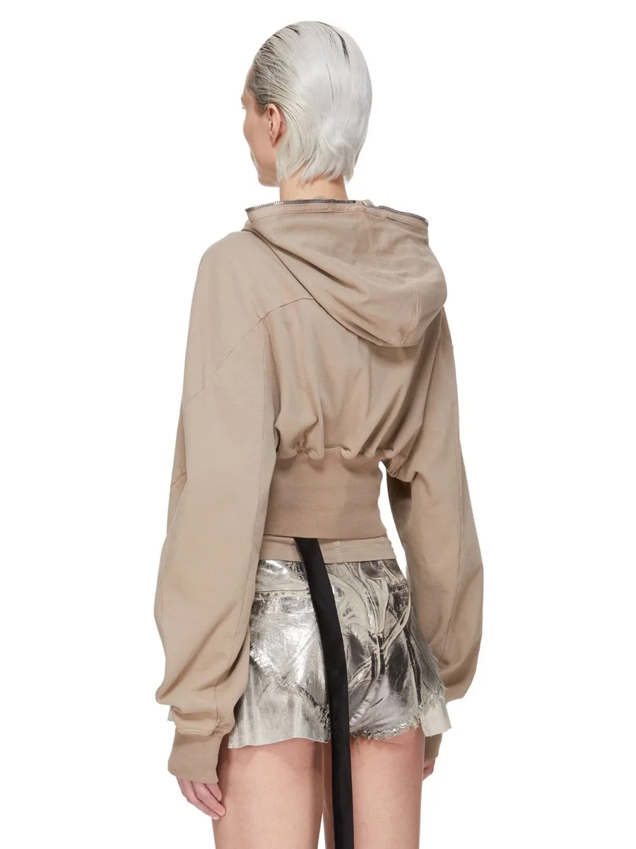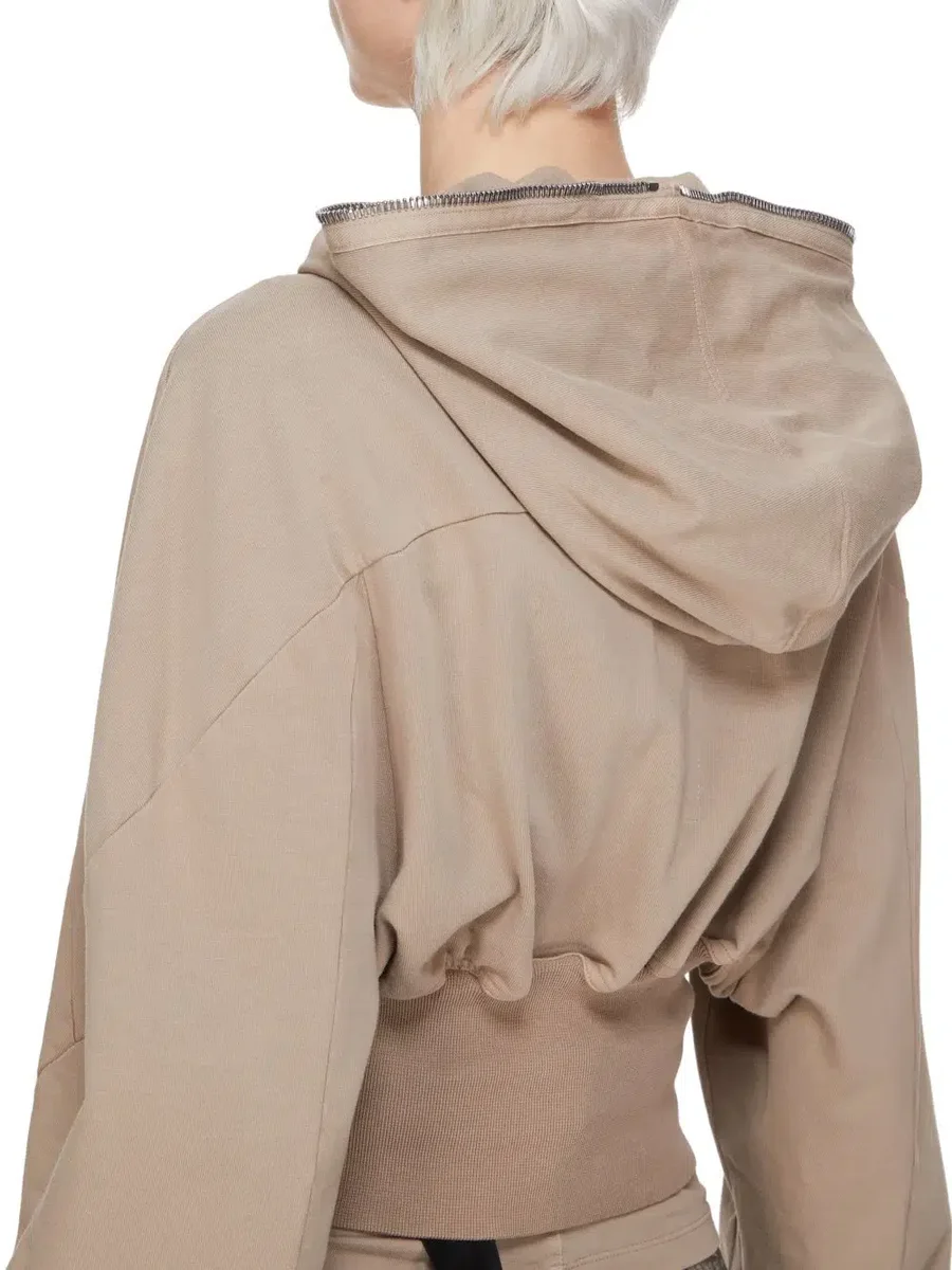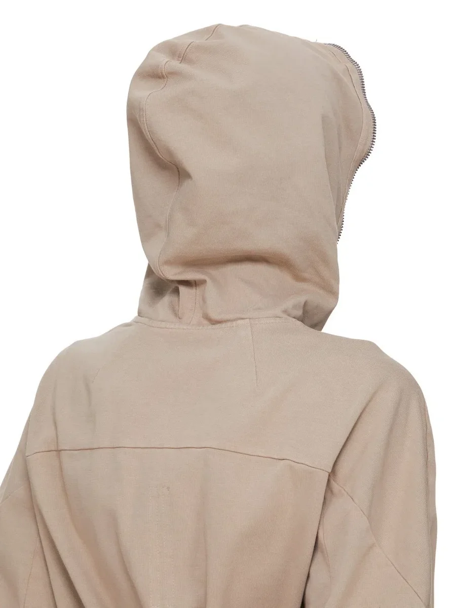 THIS COLLAGE GIMP HOODIE IS CROPPED WAIST LENGTH AND HAS LONG SLEEVES. IT HAS A FRONT ZIPPER CLOSURE WITH EXPOSED ZIPPER TAPE THAT RUNS FROM THE HEM ALL THE WAY UP THROUGH THE HOOD, ALLOWING IT TO BE ZIPPERED COMPLETELY CLOSED OVER THE FACE. IT FEATURES GEOMETRIC GIRDERED SHOULDERS AND STITCHING, A FRONT AND BACK YOKE AND HAS RIBBED CUFFS AND WIDE WAISTBAND.