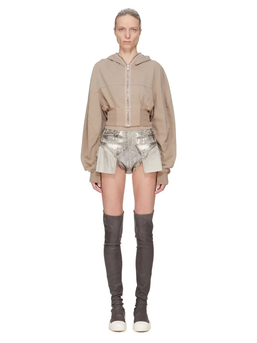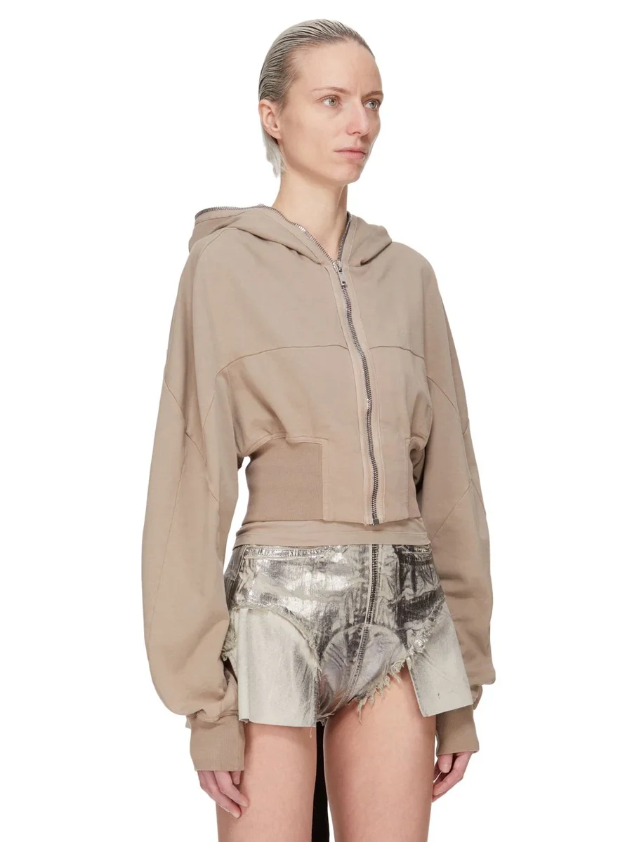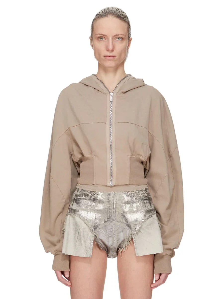 THIS COLLAGE GIMP HOODIE IS CROPPED WAIST LENGTH AND HAS LONG SLEEVES. IT HAS A FRONT ZIPPER CLOSURE WITH EXPOSED ZIPPER TAPE THAT RUNS FROM THE HEM ALL THE WAY UP THROUGH THE HOOD, ALLOWING IT TO BE ZIPPERED COMPLETELY CLOSED OVER THE FACE. IT FEATURES GEOMETRIC GIRDERED SHOULDERS AND STITCHING, A FRONT AND BACK YOKE AND HAS RIBBED CUFFS AND WIDE WAISTBAND.