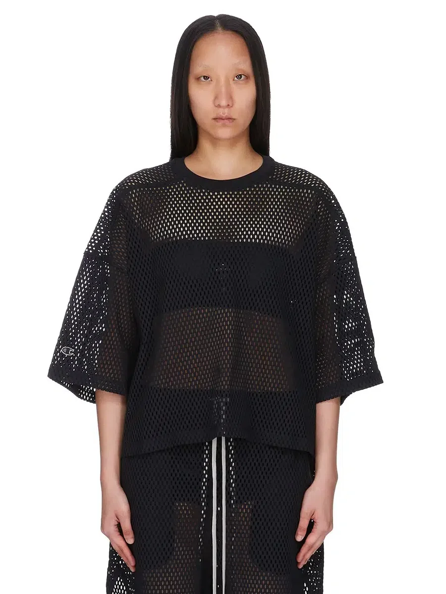 CHAMPION X RICK OWENS SS25 TOMMY T CROPPED IN BLACK OPEN MESH JERSEY