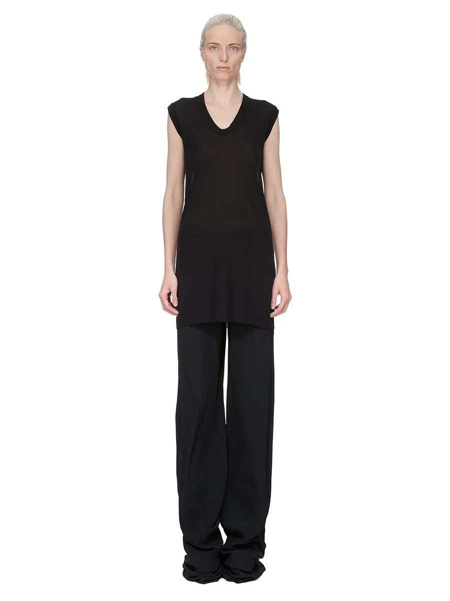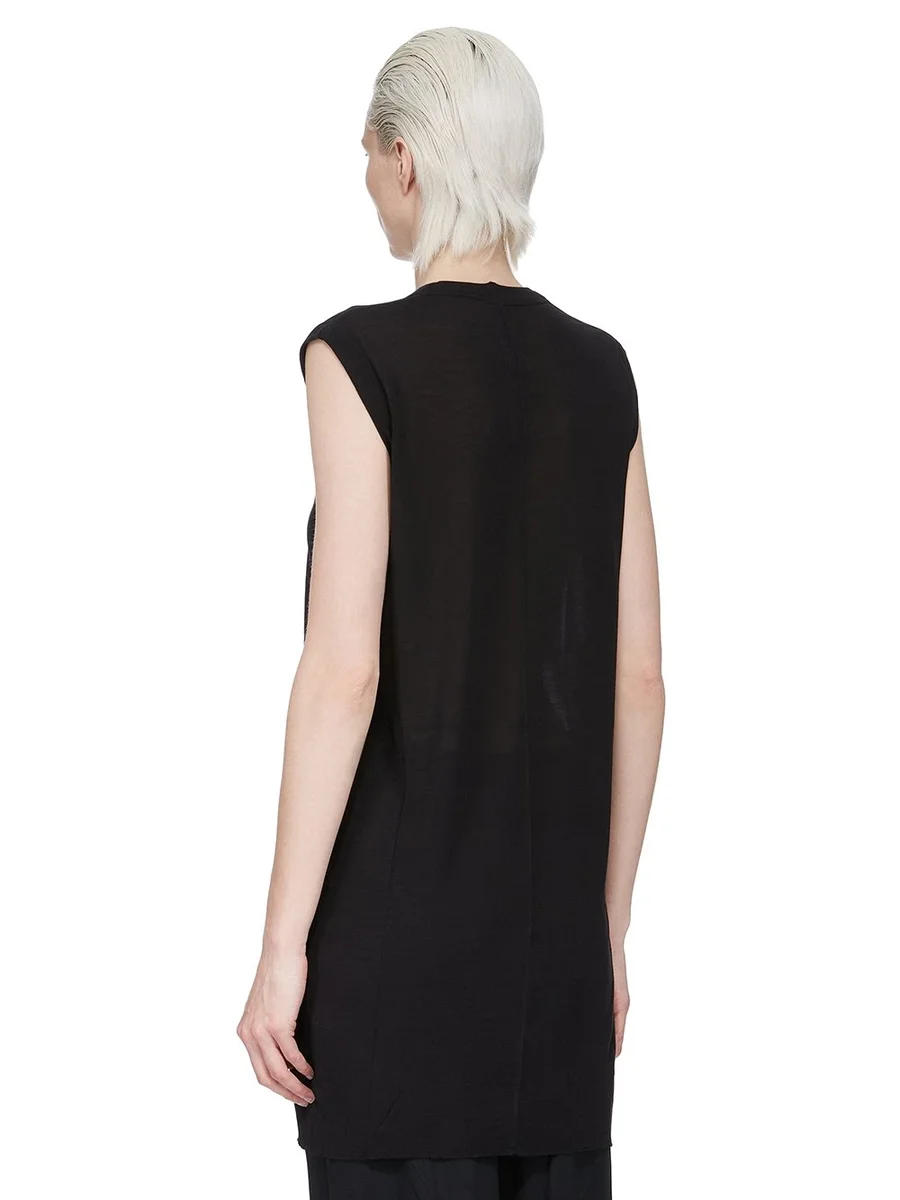 THIS BASIC SL T IS BELOW HIP LENGTH AND SLEEVELESS. IT HAS A RIBBED ROUND NECK, RAW CUT HEM AND REINFORCED RAW SHOULDERS. IT FEATURES THE SIGNATURE SINGLE SEAM RUNNING DOWN THE CENTRE BACK SPINE.
