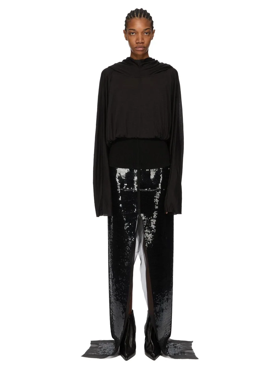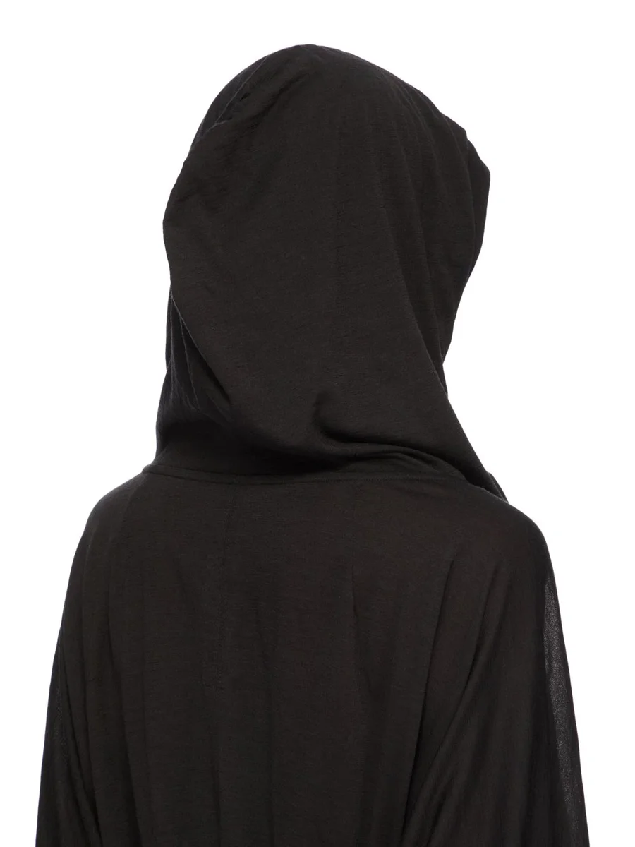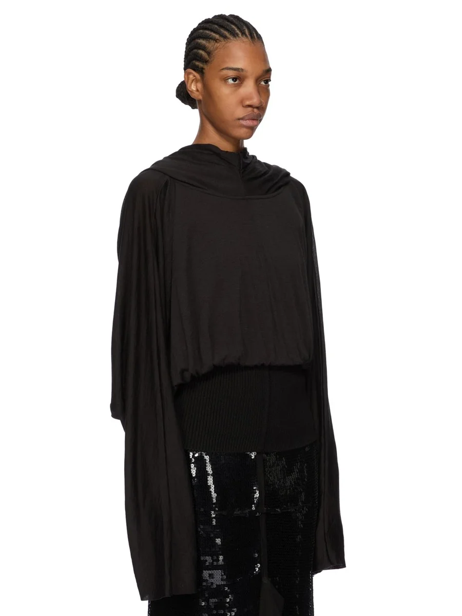 RICK OWENS FW25 CONCORDIANS RUNWAY CROPPED HOODED TUNIC IN BLACK SILK WOOL JERSEY
