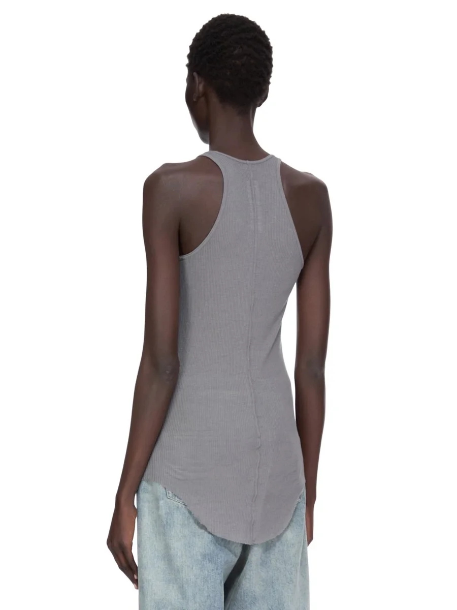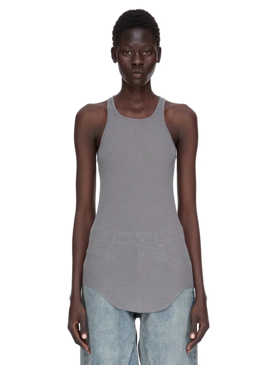 THIS BASIC RIB TANK IS HIP LENGTH WITH A ROUNDED RAW CUT HEM THAT DIPS IN FRONT AND BACK. IT HAS A ROUND NECKLINE AND THIN SHOULDER STRAPS THAT FLOW INTO A SLIGHT RACER BACK. IT FEATURES THE SIGNATURE SINGLE SEAM RUNNING DOWN THE CENTRE BACK SPINE.