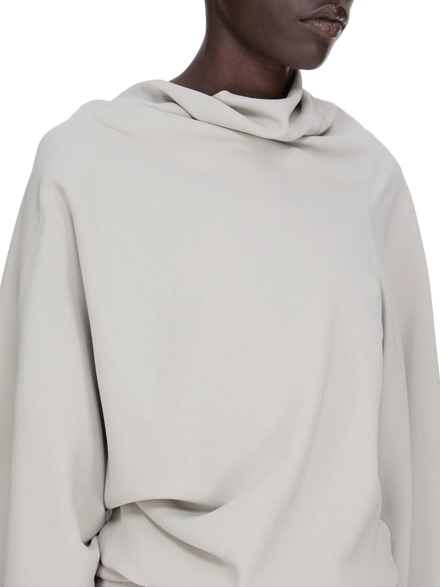 THIS CYLINDER TOP IS HIP-LENGTH, WITH A DRAPED BIAS CUT BODY, ELBOW-LENGTH WIDE SLEEVES AND A HIGH DRAPED COWL NECK THAT HAS AN ASYMMETRICAL OPENING AT BACK. IT GATHERS INTO THE WAIST AND FINISHES IN A TIGHT BODY TO THE HIP.