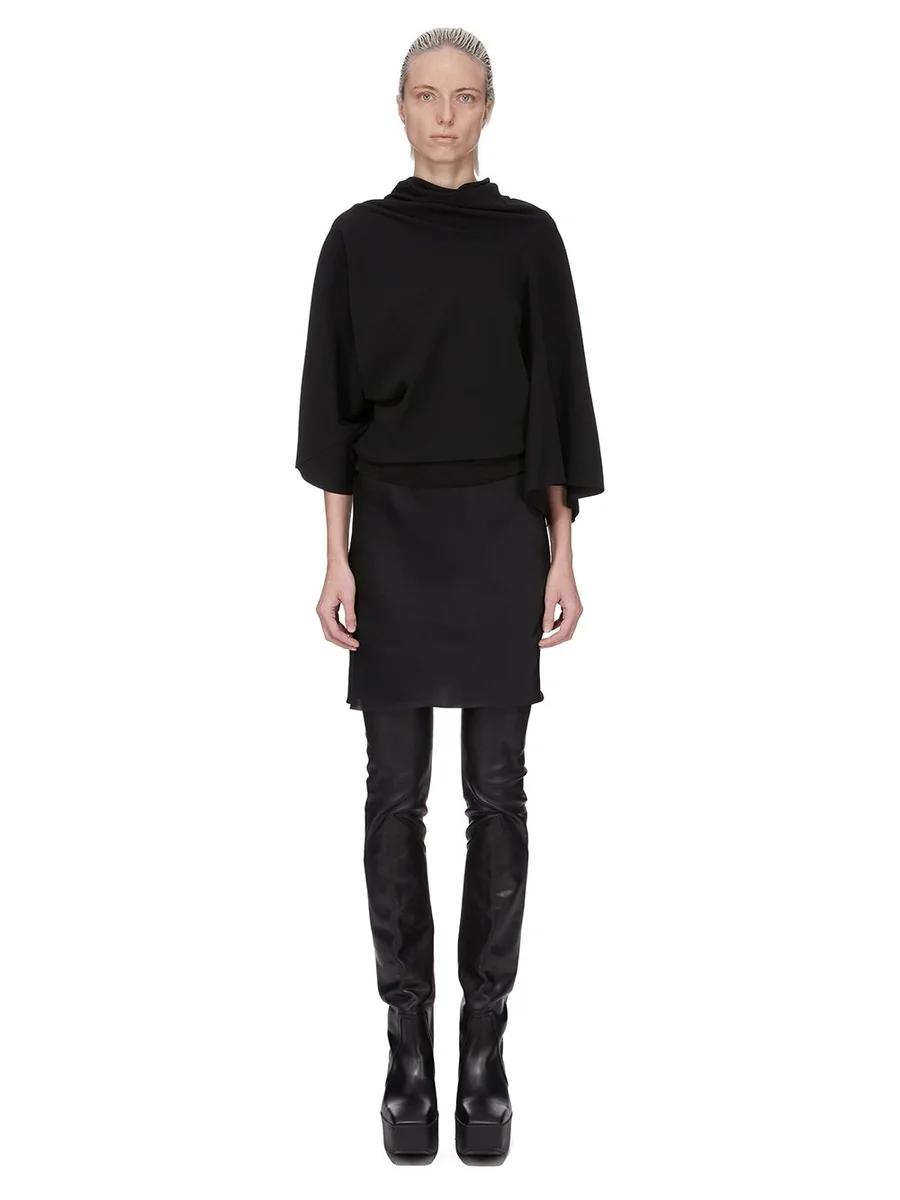THIS CYLINDER TOP IS HIP-LENGTH, WITH A DRAPED BIAS CUT BODY, ELBOW-LENGTH WIDE SLEEVES AND A HIGH DRAPED COWL NECK THAT HAS AN ASYMMETRICAL OPENING AT BACK. IT GATHERS INTO THE WAIST AND FINISHES IN A TIGHT BODY TO THE HIP.