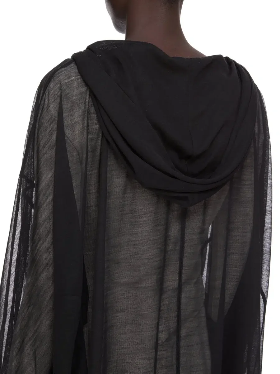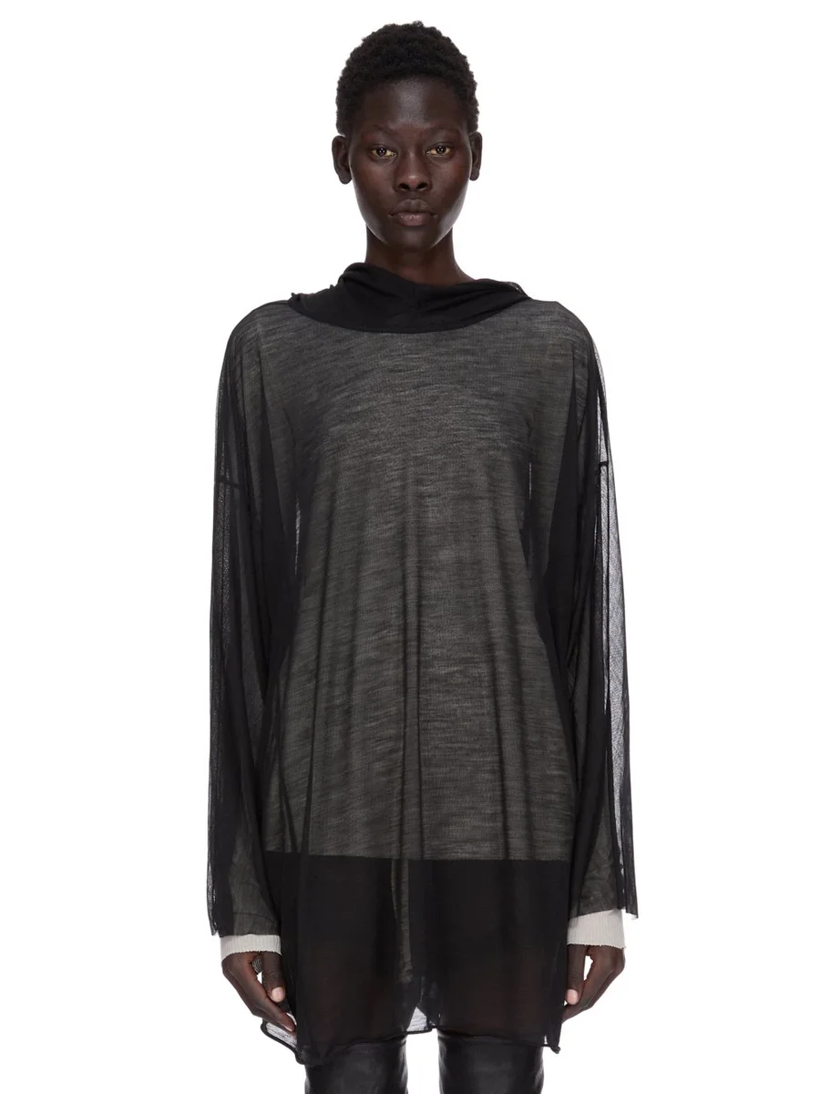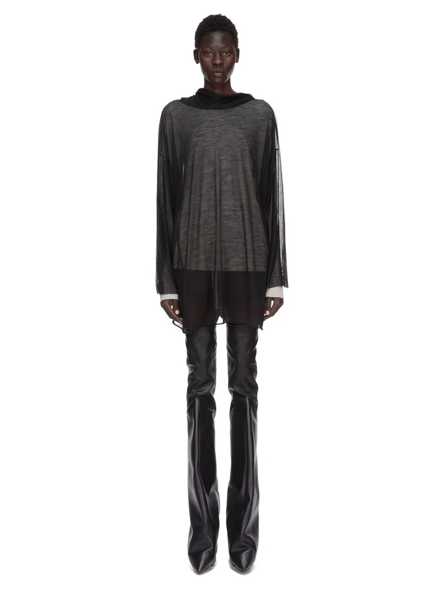 RICK OWENS FW25 CONCORDIANS HOODED TUNIC IN BLACK SHEER WOOL JERSEY